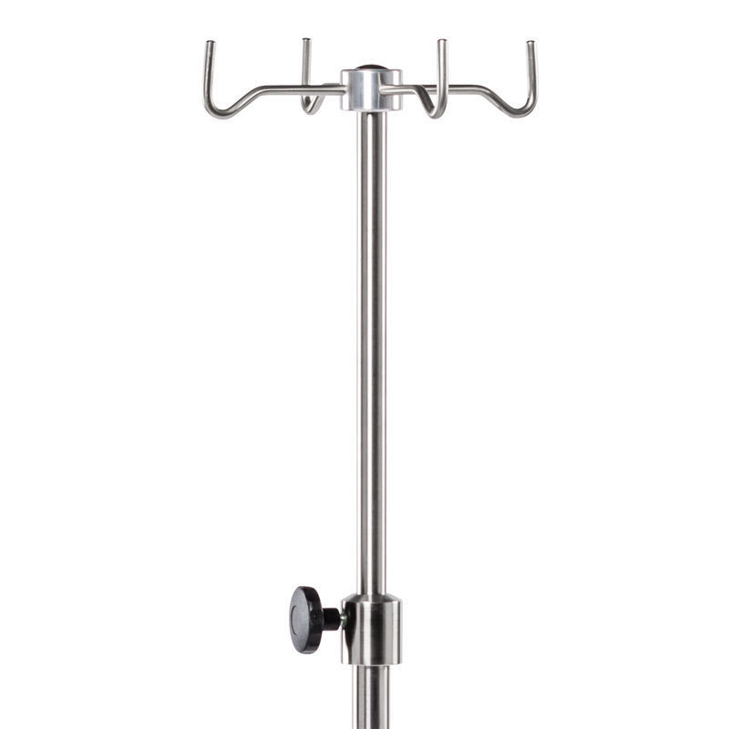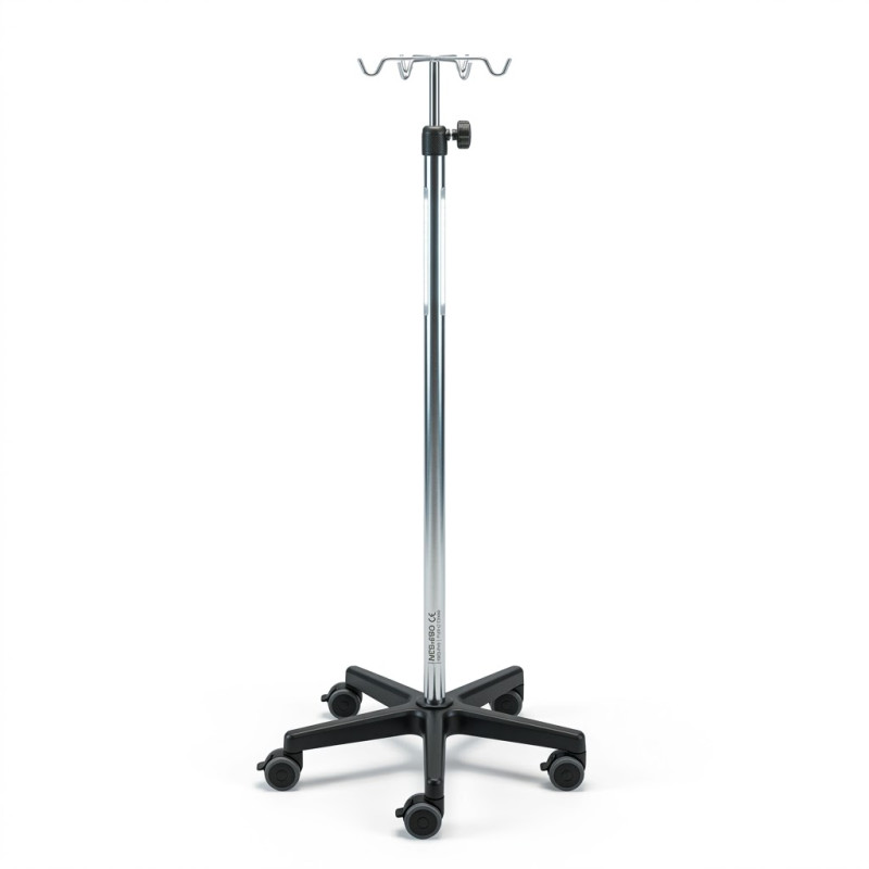 Porta suero en acero cromado, con 4 colgadores, y base de 5 ruedas.