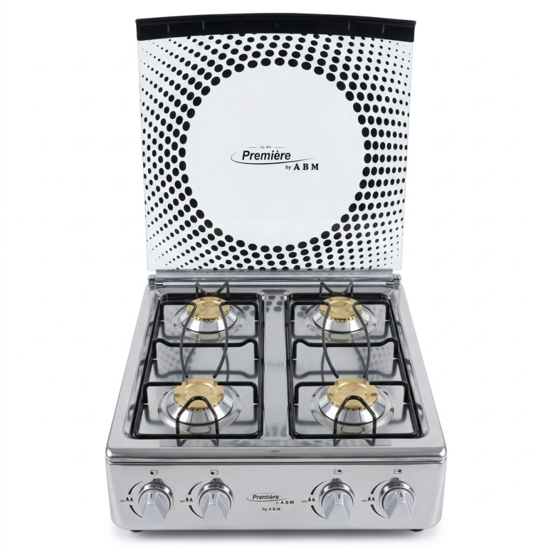 Estufa de mesa de 4 hornillas de acero inoxidable y tapa de vidrio.