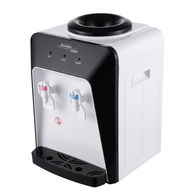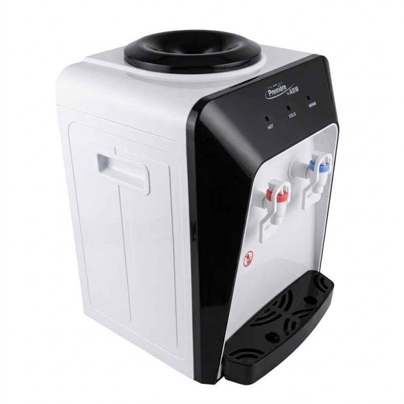 Dispensador de agua fria y caliente de color blanco y negro para colocar sobre mesa.