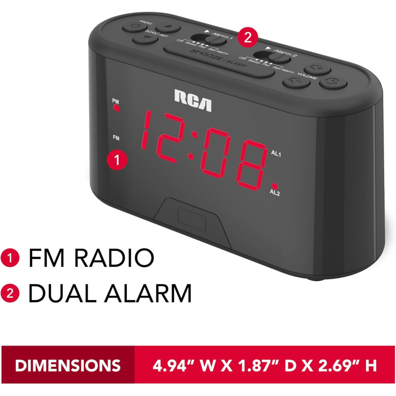 Radio reloj digital negro con alarma de doble despertador, temporizador de sueño y repetición; función de despertar a radio FM o alarma; gran pantalla fácil de leer.