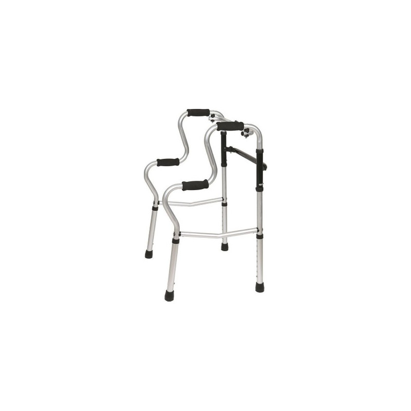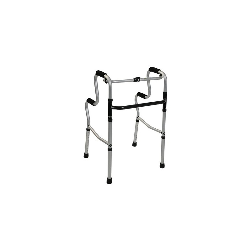 Andador plegable de altura ajustable de aluminio con marco ancho con una gran cantidad de ajustes de altura. Además, una viga en forma de H agrega estabilidad.